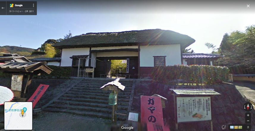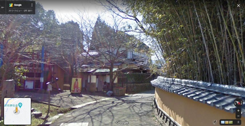 | グーグルのストリートビューの画像。右手の竹林が視界をさえぎっているので、奥の建物まで近寄った画像。 ↓ |