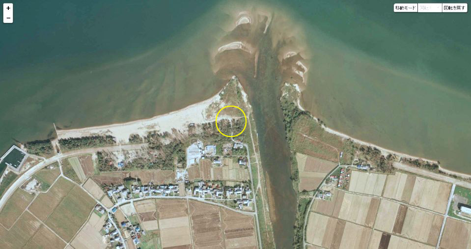 | 国土地理院の「国土変遷アーカイブ」による1982年撮影の同地の航空写真。黄色い円内がロケ推定地。古い航空写真なので1986年竣工の日野川大橋は写っていない。 ↓ |