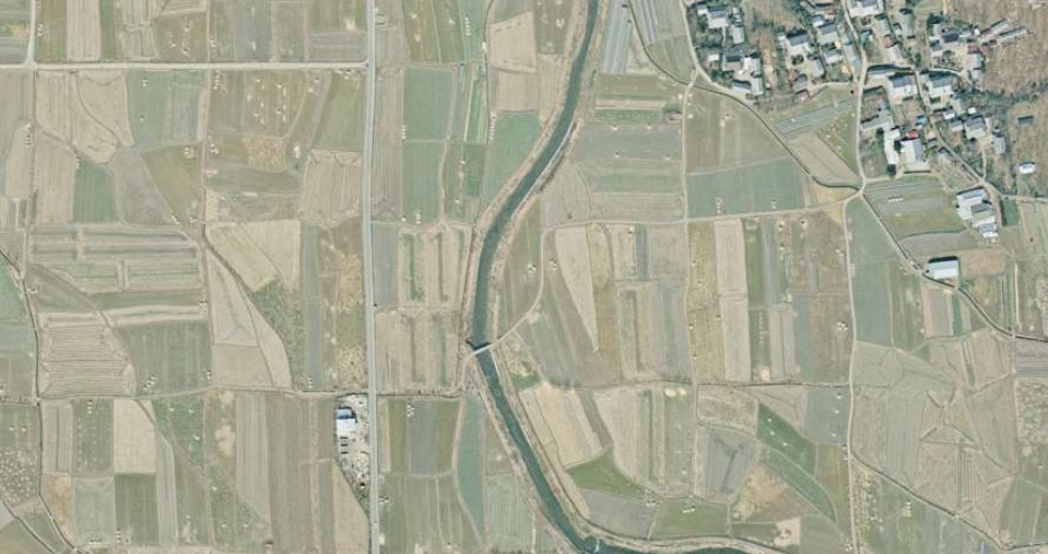 | 国土地理院の「国土変遷アーカイブ」による1974年撮影の航空写真。中央の橋がロケ地かと思われる。1995年撮影の航空写真にも写っているが、今では耕地整理により無くなった。 ↓ |