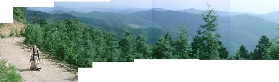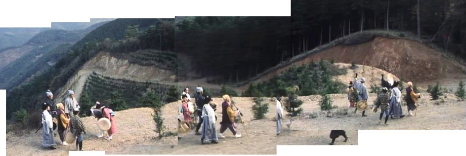 「関所に巣喰う鬼退治」のシーン。「遠山の金さん」は左手下の枝道を見下ろしている。