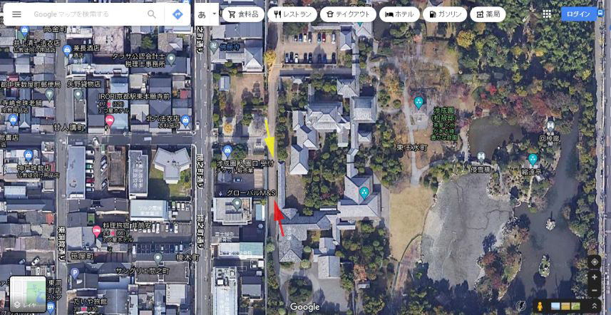 グーグルの空中写真。画像Aは黄色い矢印方向、画像Bは赤い矢印方向に撮っている。