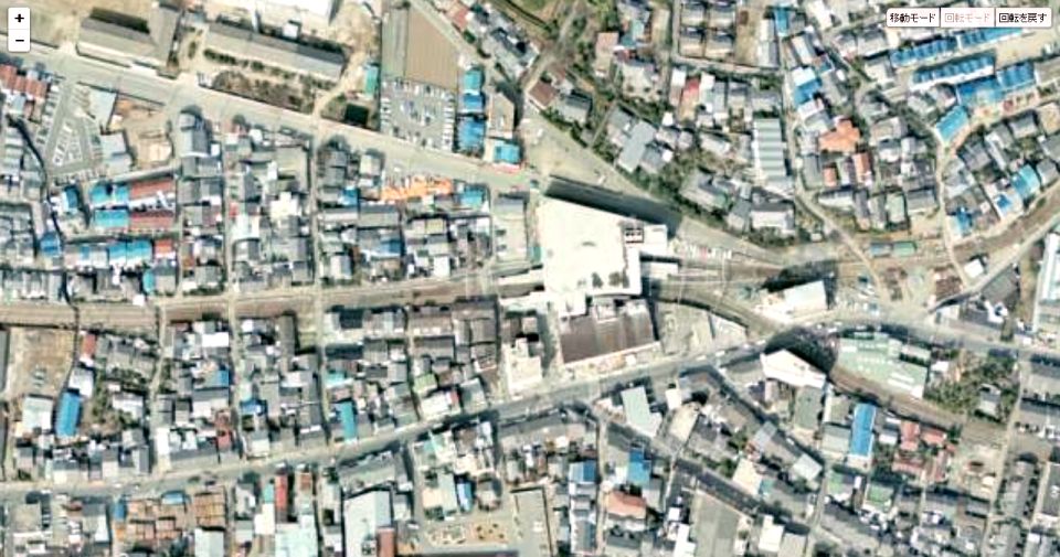 | 国土地理院の「国土変遷アーカイブ」による現地周辺の1974年撮影の航空写真。駅舎西に踏み切りが見える。 ↓ |