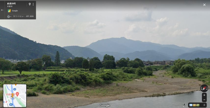 京都市西京区嵐山朝月町の松尾橋の上から北西方向を見たグーグルのストリートビューの画像。奥の堤防上の木立ちがロケ地かと思われる。