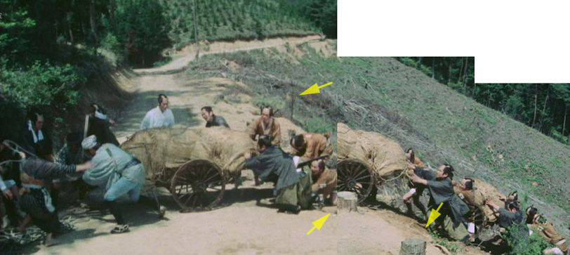 | 「吉宗評判記 暴れん坊将軍」のシーン。矢印に切り株が見える。 ↓ |