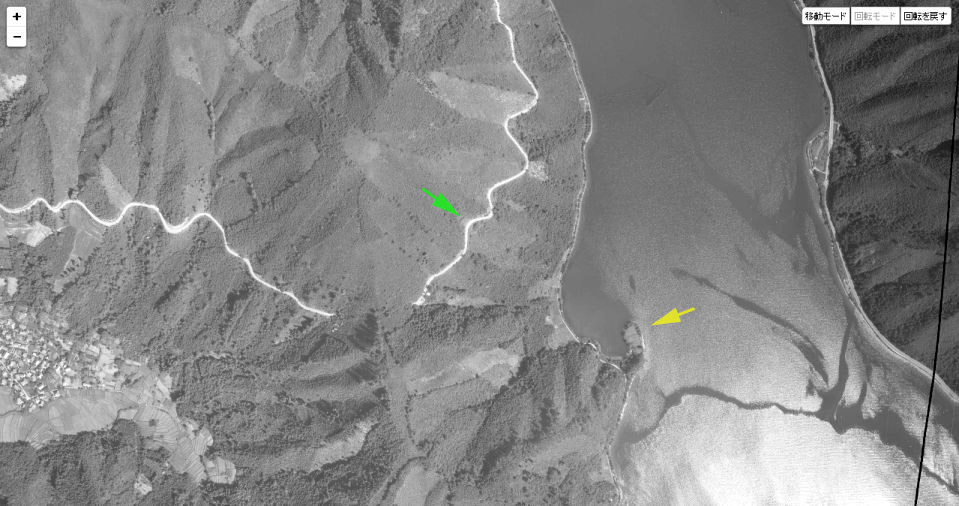 | 国土地理院の「国土変遷アーカイブ」による現地周辺の1961年撮影の航空写真。黄色い矢印の小半島方向を、緑の矢印あたりから旧道越しに撮っていると思う。 ↓ |