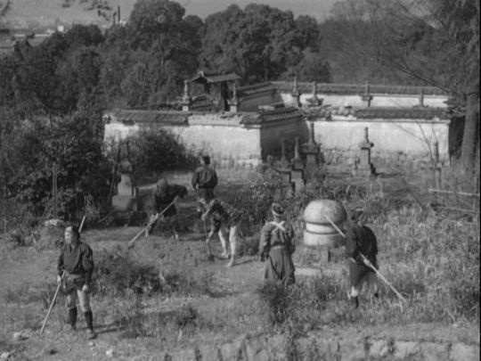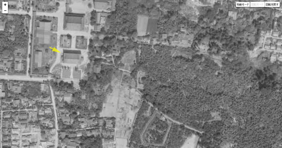 | 国土地理院の「国土変遷アーカイブ」による現地周辺の1961年撮影の航空写真。黄色い矢印が東福寺の三門。中央の荒れ地に、本編のような墓所があったのであろう。 ↓ |
