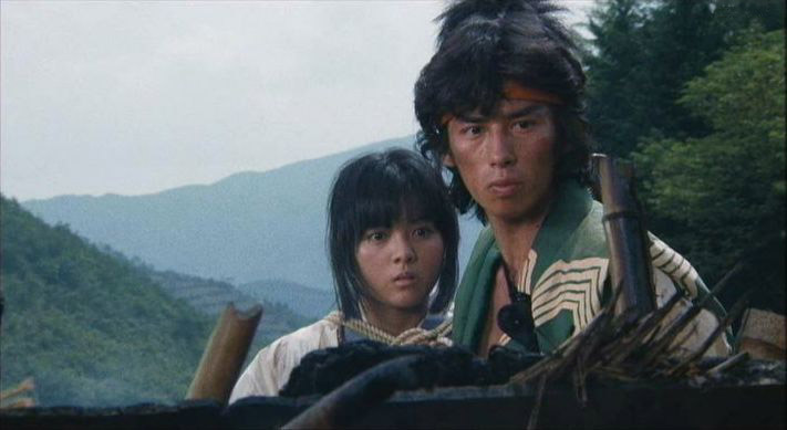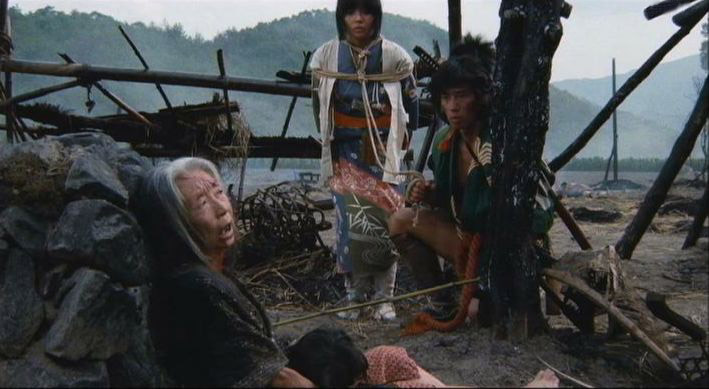 | 「京都府船井郡京丹波町市森」の琴滝だと思う。滝の前にセットを組んだのか、屋内セットに滝の画像を合成したのかは不明。 ↓ |