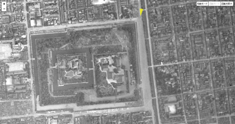 国土地理院の「国土変遷アーカイブ」による現地周辺の1947年米軍撮影の航空写真。黄色い矢印方向に撮っていると思う。