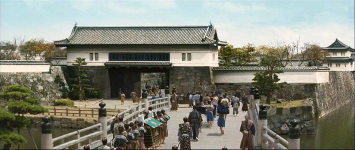 | 「兵庫県姫路市本町」の姫路城の桜門橋と大手門に、CGの城門・城壁・櫓を合成。(撮影協力クレジットあり) ↓ |