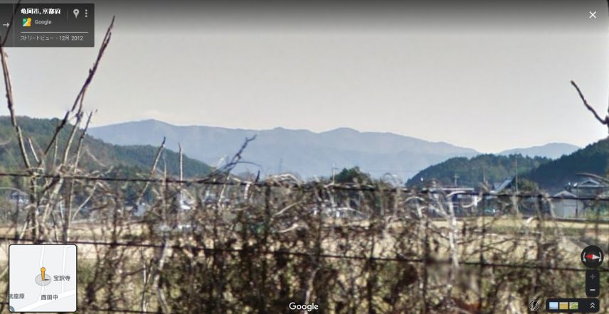 | 現地のやや東から取得したグーグル・ストリートビューの画像。山並みが一致。 ↓ |
