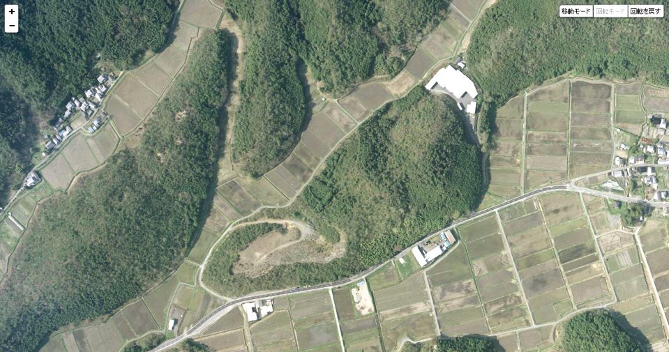 | 国土地理院の「国土変遷アーカイブ」による現地周辺の2008年撮影の航空写真。中央下の拓かれた山がロケ地かと思われる。 ↓ |