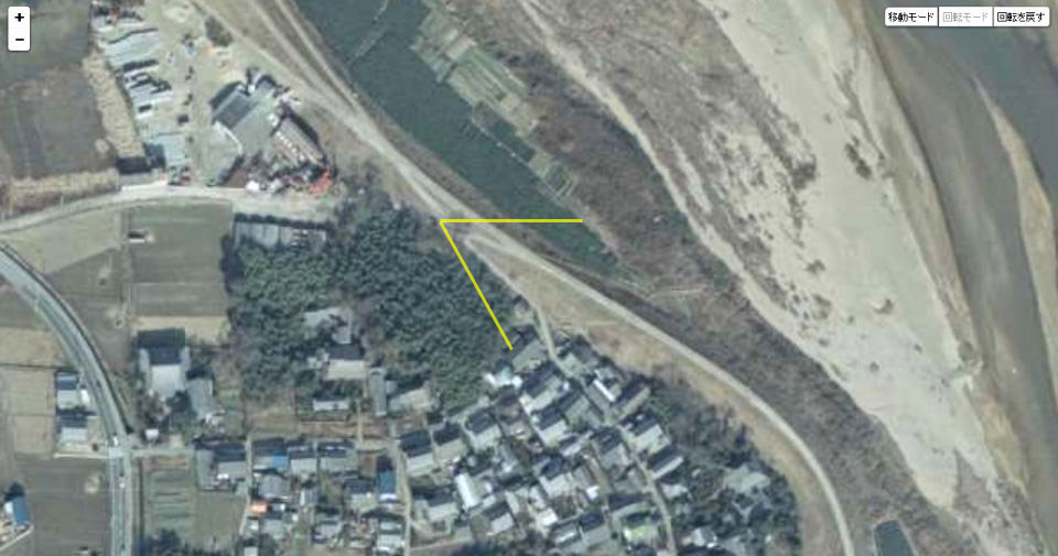 国土地理院の「国土変遷アーカイブ」による現地周辺の1974年撮影の航空写真。黄色い画角で撮っている。