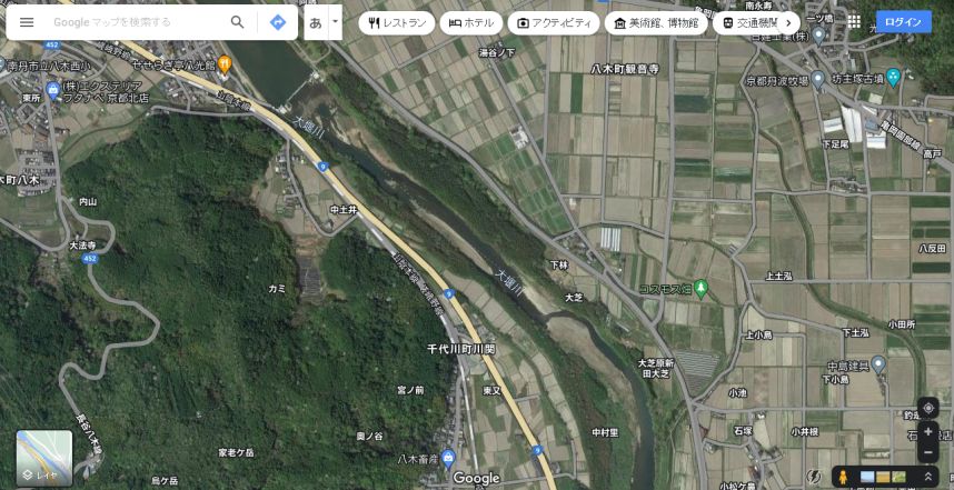 グーグルの空中写真。中央あたりの河原がロケ地かと思われる。