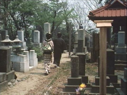 墓地にある鐘楼。奥に見える屋根は松荘堂。