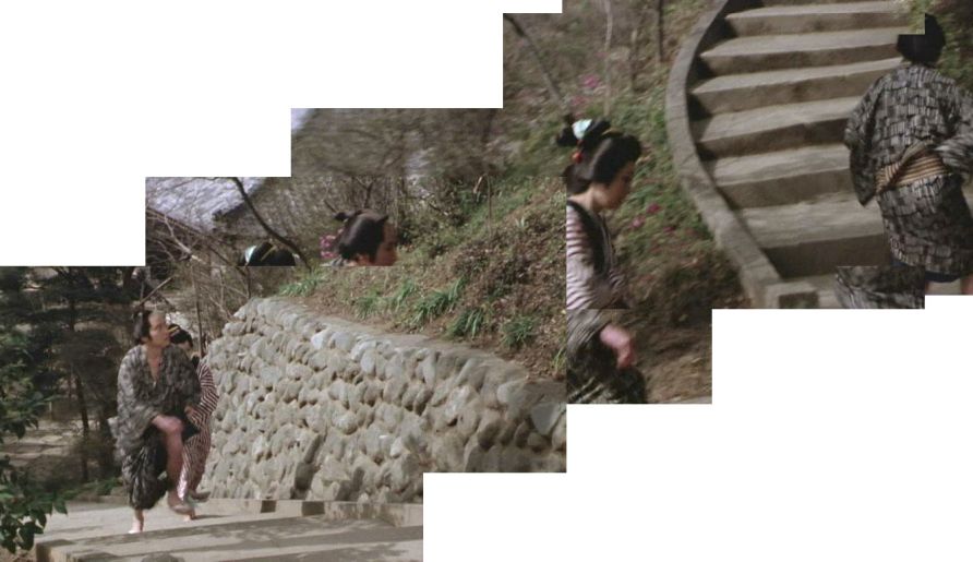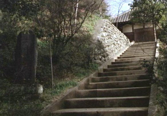 石段から本堂見下ろし、および松荘堂から墓地へ上がる石段。