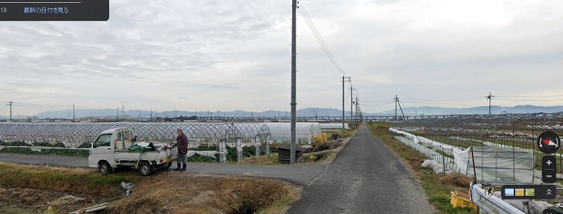 | 戸津池の東沿いから取得したグーグル・ストリートビューの画像。戸津池はゴルフの打ち放し場となっていて、見通しが利かない。また池の東側は本編に見えるような大きな土手となっている。 ↓ |