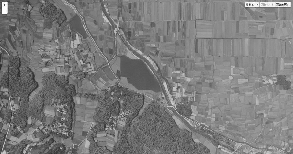 | 国土地理院の「国土変遷アーカイブ」による現地周辺の1961年撮影の航空写真。本編は池の西沿いの道から東を見ていると思われる。 ↓ |
