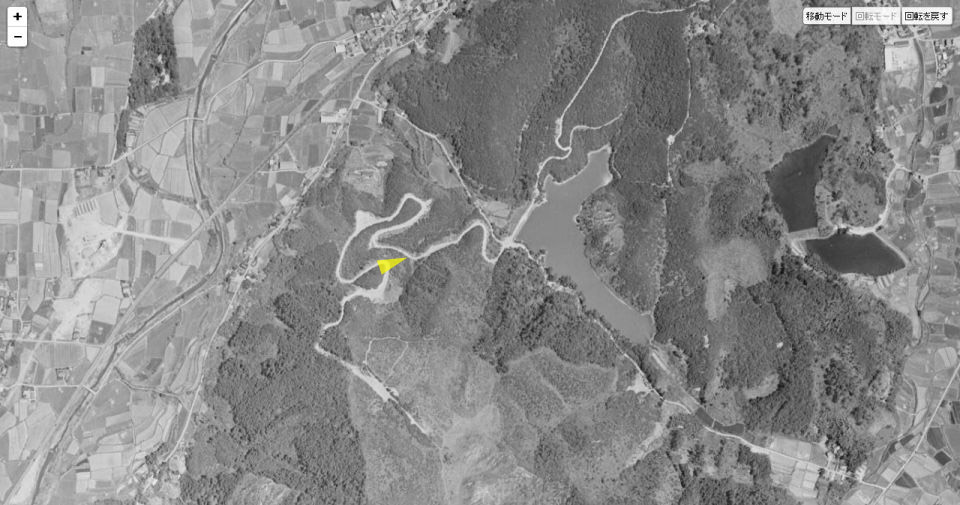 | 国土地理院の「国土変遷アーカイブ」による現地周辺の1969年撮影の航空写真。黄色い矢印方向に中山池を見下ろしている。 ↓ |
