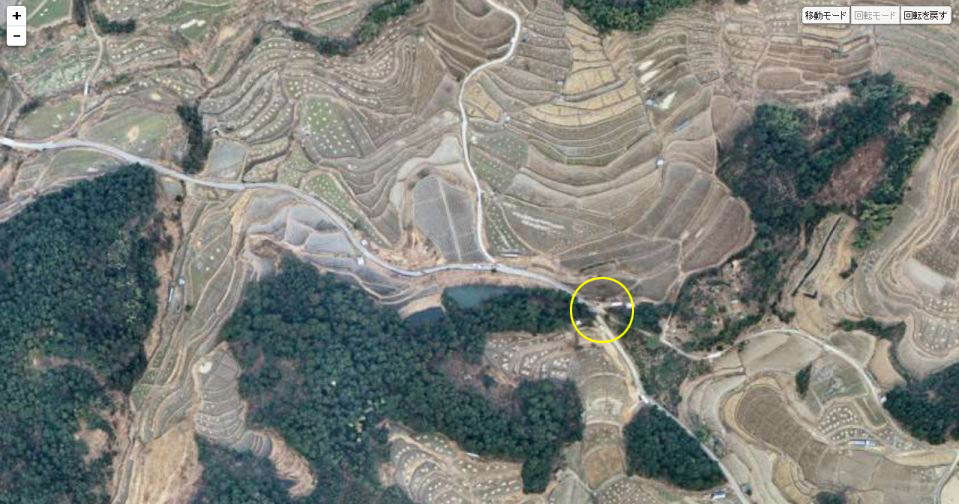 | 国土地理院の「国土変遷アーカイブ」による現地周辺の1975年撮影の航空写真。黄色い円内がロケ地。 ↓ |
