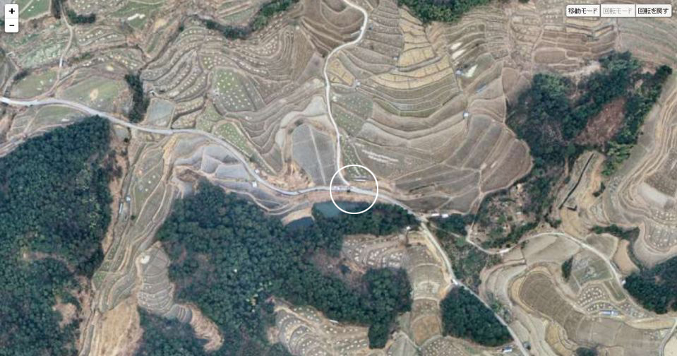| 国土地理院の「国土変遷アーカイブ」による現地周辺の1975年撮影の航空写真。白い円内がロケ地。 ↓ |
