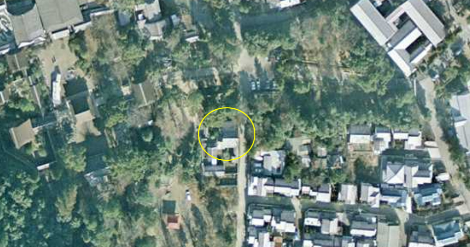 国土地理院の「国土変遷アーカイブ」による現地周辺の1974年撮影の航空写真。黄色い円内がロケ推定地。屋根の北側がやけに長く見える。