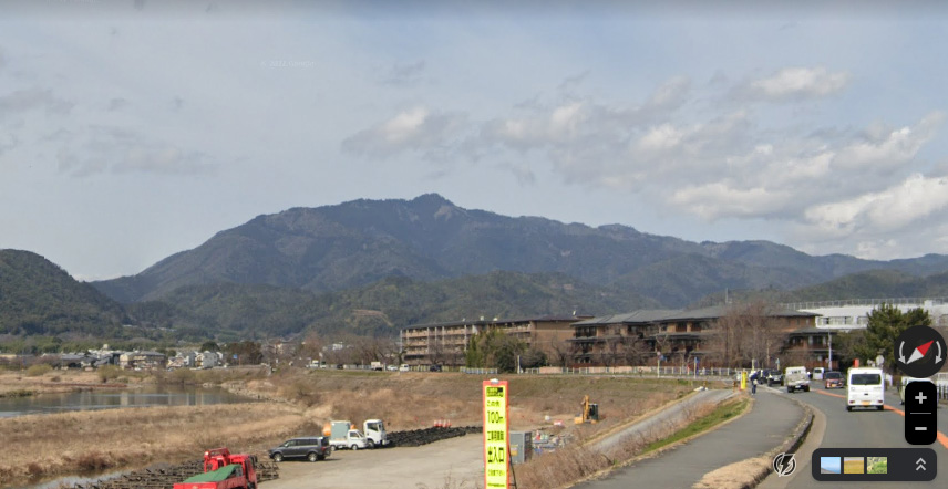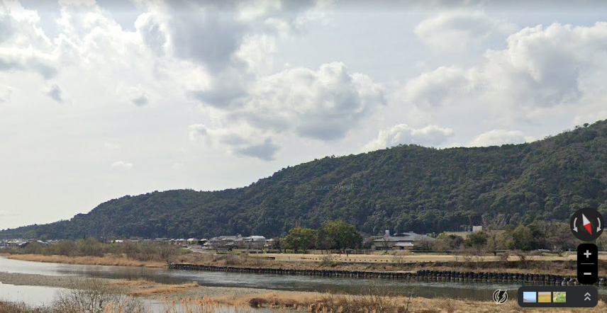 | グーグルのストリートビューの画像。現地は見通しが利かないため、近隣の桂川からの画像。 ↓ |
