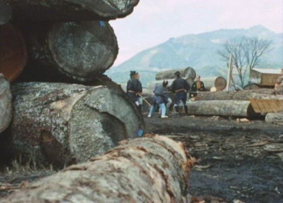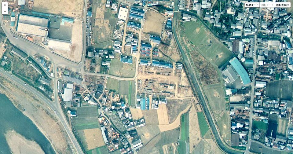 | 国土地理院の「国土変遷アーカイブ」による現地周辺の1974年撮影の航空写真。中央の材木置き場がロケ地かと思われる。 ↓ |