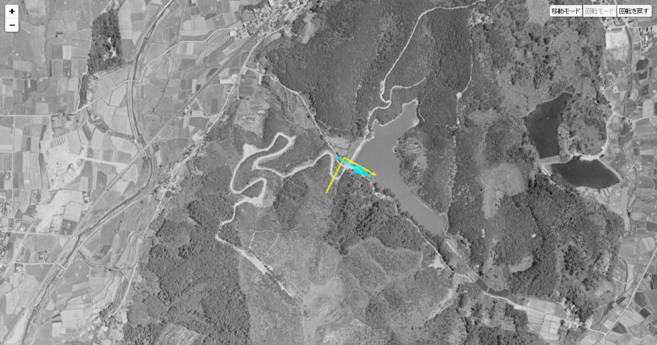 | 国土地理院の「国土変遷アーカイブ」による現地周辺の1969年撮影の航空写真。画像Aは黄色い画角で進み、画像Bは水色の方向に進んで行く。 ↓ |