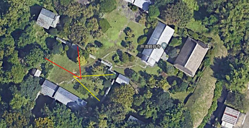グーグルの空中写真。画像Aは黄色い画角、画像Bは赤い画角で撮っていると思う。