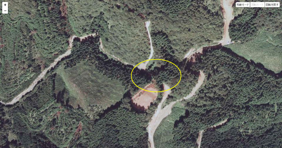 国土地理院の「国土変遷アーカイブ」による現地周辺の1987年撮影の航空写真。黄色い円内がロケ地。