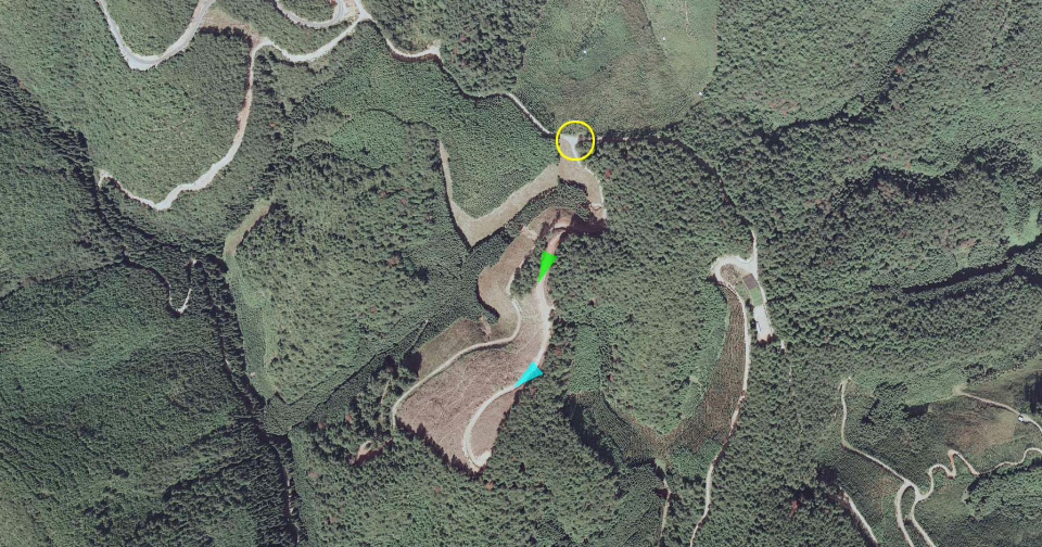 | 国土地理院の「国土変遷アーカイブ」による現地周辺の1987年撮影の航空写真。画像Aは黄色い円内、画像Bは緑の矢印、画像Cは水色の矢印に撮っていると思う。矢印に沿った道は、南の山頂への上り道である。 ↓ |