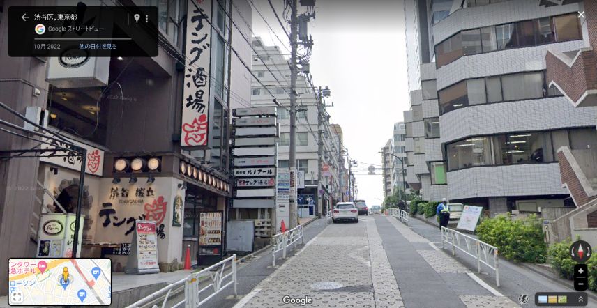 | 「東京都渋谷区桜丘町15と16の間」から南を見る。奥の左手の建物は「渋谷コープ(1963年建設)」。「おした産婦人科」という看板が見えるが、「押田レディースクリニック」「押田皮膚クリニック」と院名を変えて健在。 ↓ |