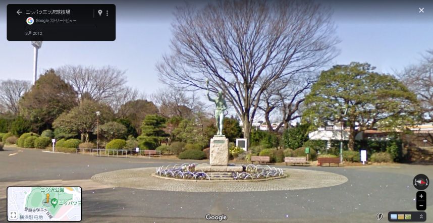 | 「横浜市神奈川区三ツ沢西町」の三ツ沢公園。右手の銅像は「平沼さんの像」。 ↓ |