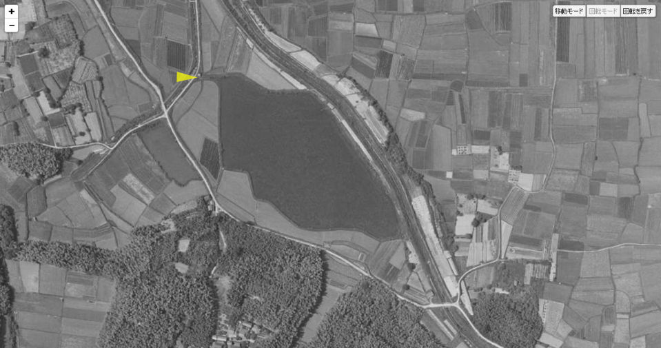 | 国土地理院の「国土変遷アーカイブ」による現地周辺の1961年撮影の航空写真。黄色い矢印方向に撮っている。 ↓ |