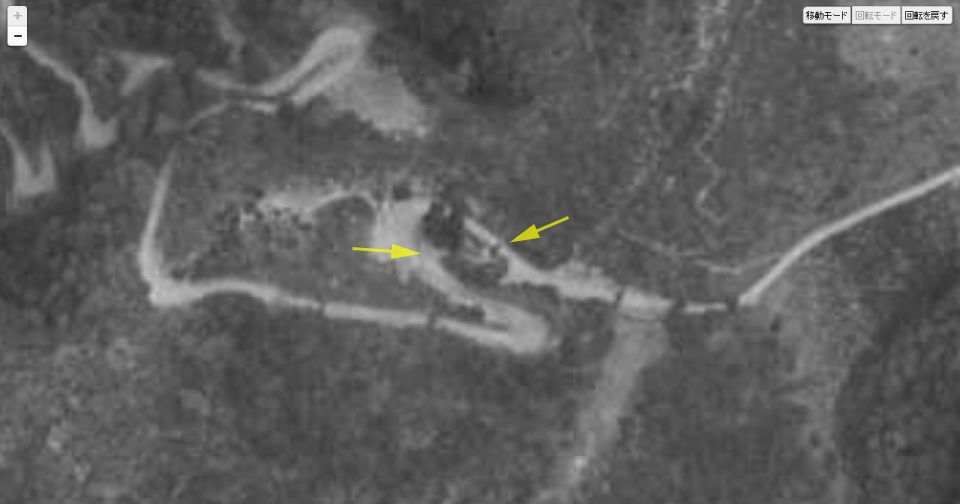 | 国土地理院の「国土変遷アーカイブ」による現地周辺の1961年撮影の航空写真。S字カーブの途中に、黄色い矢印間をショートカットする道があるように見える。「大菩薩峠 竜神の巻」も参照のこと。 ↓ |