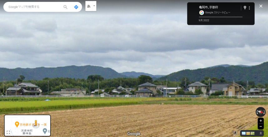 グーグルのストリートビューの画像。奥の木立のあたりが桂川の土手。