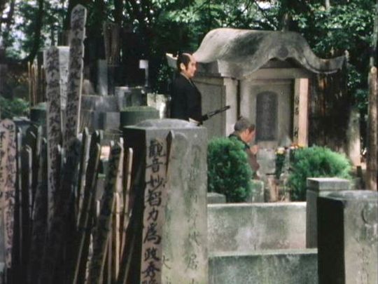 | 「東京都稲城市矢野口」の妙覚寺の墓地。「右門捕物帖」の墓石と一致。 ↓ |