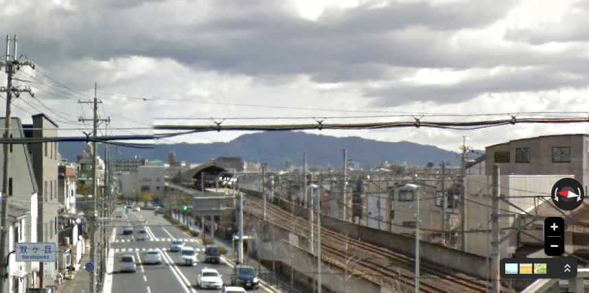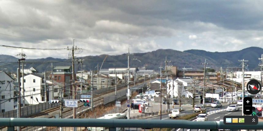 | JR花園駅西の高架から取得したグーグルのストリートビューの画像。とにかく嵯峨嵐山のあたりは見通しが利かない。 ↓ |