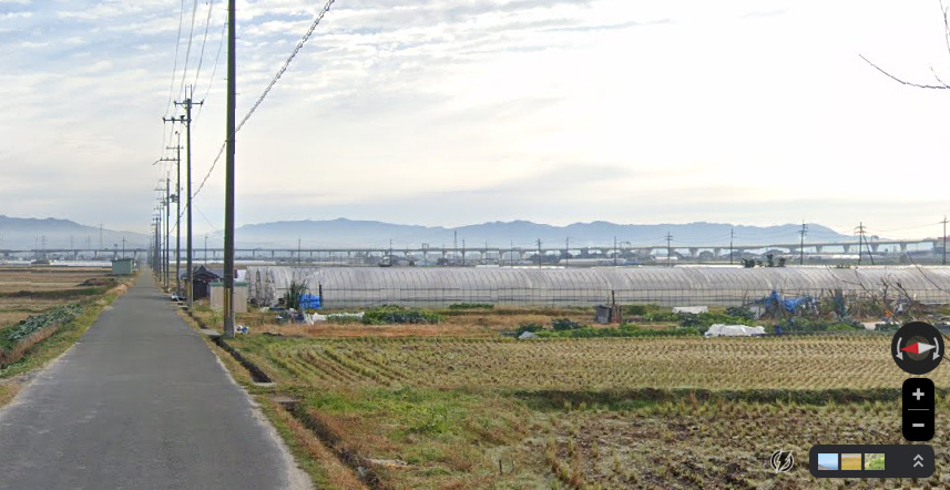 | グーグルのストリートビューの画像。現地は見通しが悪く、これは戸津池南東の国道1号線から取得した画像。本編奥に見える山は、宅地造成で無くなったらしい。 ↓ |