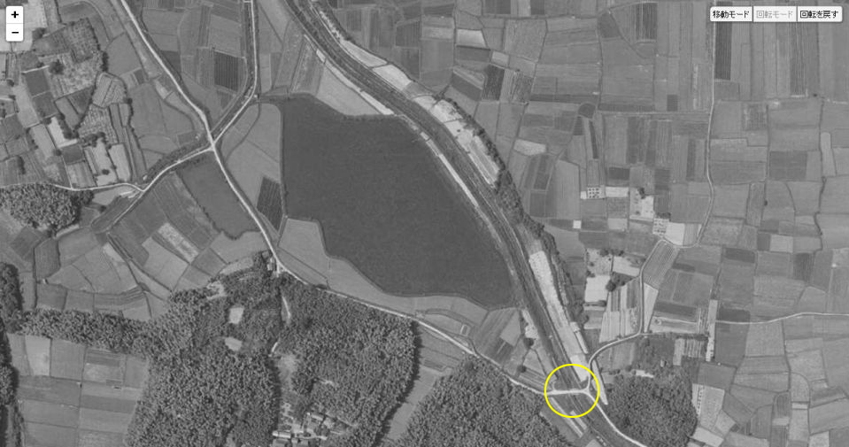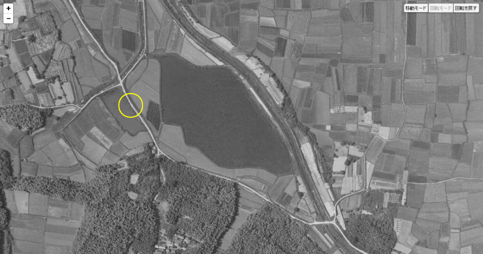 | 国土地理院の「国土変遷アーカイブ」による現地周辺の1961年撮影の航空写真。本編は黄色い円内から東方向を見ている。道沿いに池もある。 ↓ |