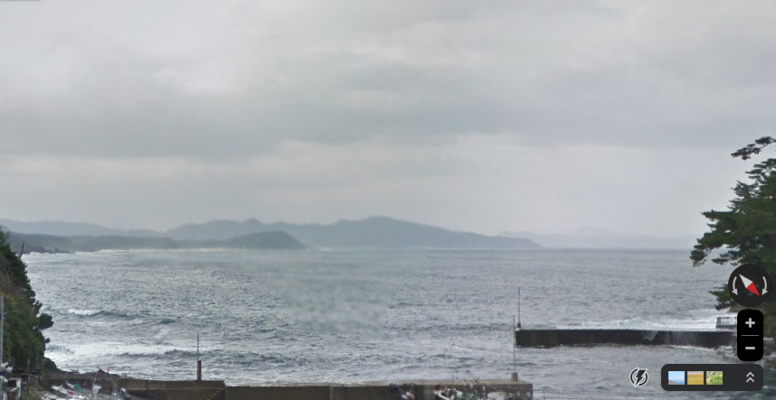 グーグルのストリートビューの画像。右手に本編遠方の陸地が見えるはずだが、建物等が邪魔で良い画像が取得できなかった。