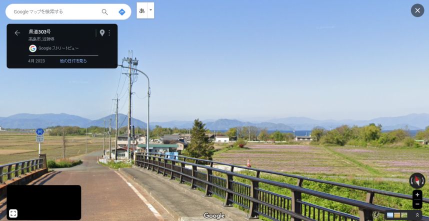 | グーグルのストリートビューの画像。湖岸沿いは見通しが利かなかったため、やや内陸から取得した画像。 ↓ |