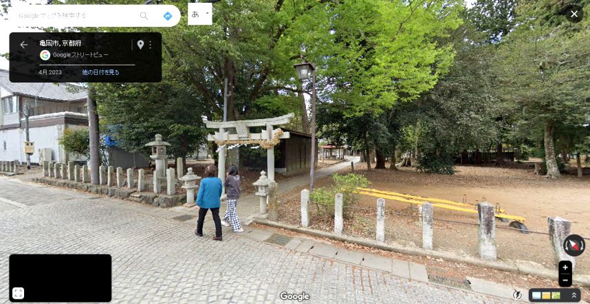 | グーグル・ストリートビューの画像。本編は境内からこちらを見ている。鳥居の数が異なるが、当時は複数立っていたのか、もしくは大道具であろう。 ↓ |