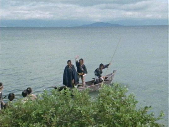 | 「滋賀県高島市安曇川町下小川」あたりの琵琶湖岸から南を見ている。右端の三角形の山は三上山。 ↓ |