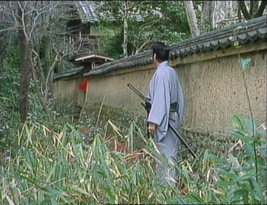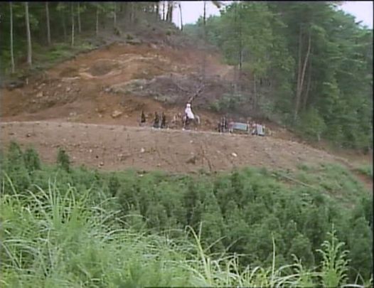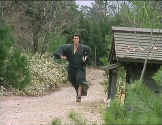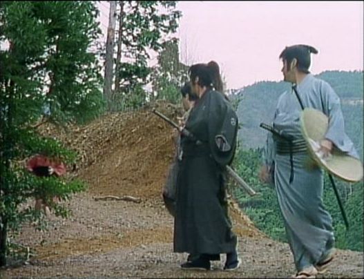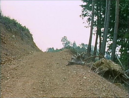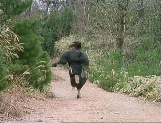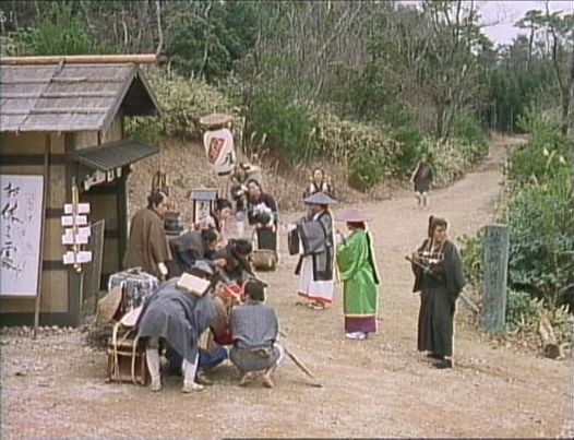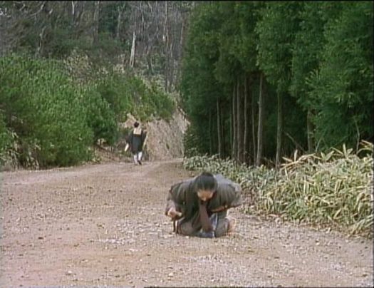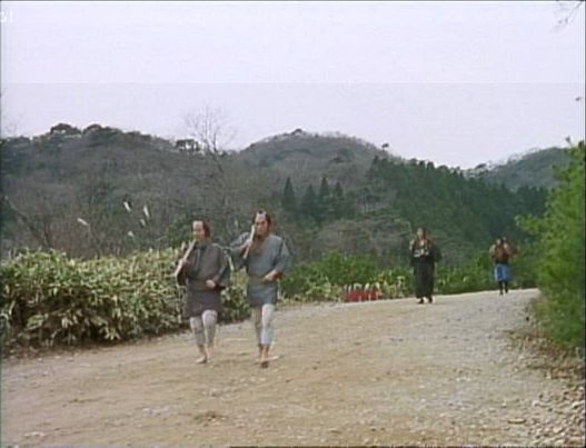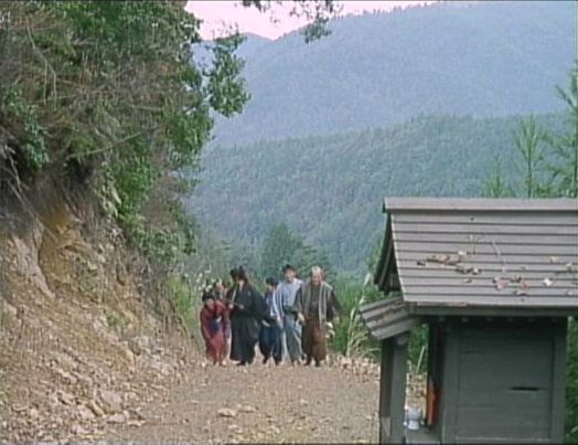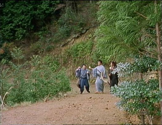 | 「三匹が斬る!」のシーン。奥の上に行く道と、右に下がる道が見える。 ↓ |