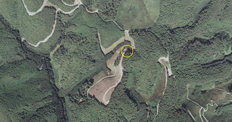 | 国土地理院の「国土変遷アーカイブ」による現地周辺の1987年撮影の航空写真。黄色い円内がロケ地かと思われる。 ↓ |