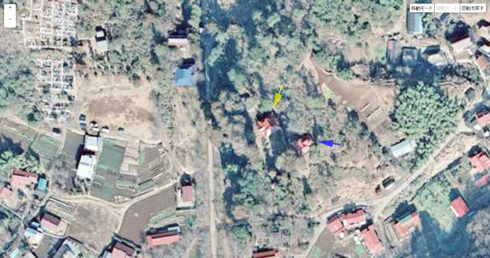| 国土地理院の「国土変遷アーカイブ」による現地周辺の1974年撮影の航空写真。黄色い矢印が観音堂、青い矢印が秋葉神社。 ↓ |