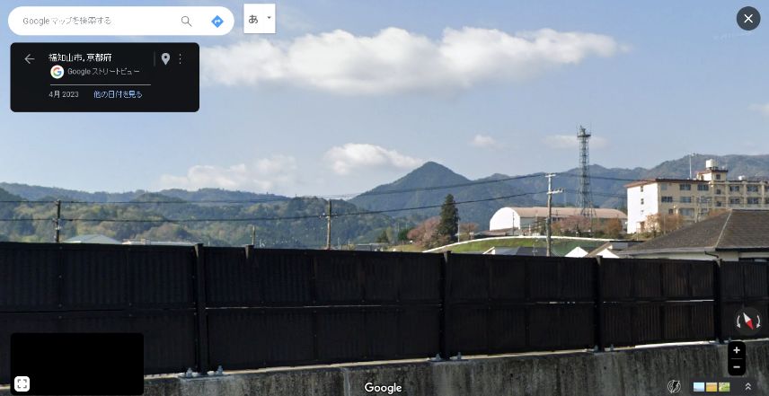| グーグル・ストリートビューの画像。右手に見えるのが福知山駐屯地。遠景の尖った山が画像Aと一致。 ↓ |