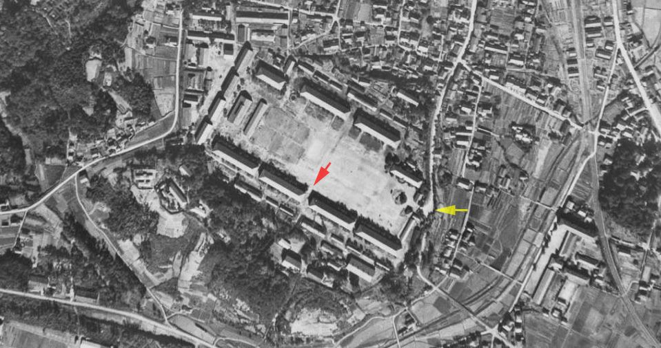 | 国土地理院の「国土変遷アーカイブ」による現地周辺の1947年米軍撮影の航空写真。画像AとBは赤い矢印方向、画像Cは黄色い矢印方向に撮っている。画像Cの門柱と歩哨舎は移設されて現存。 ↓ |
