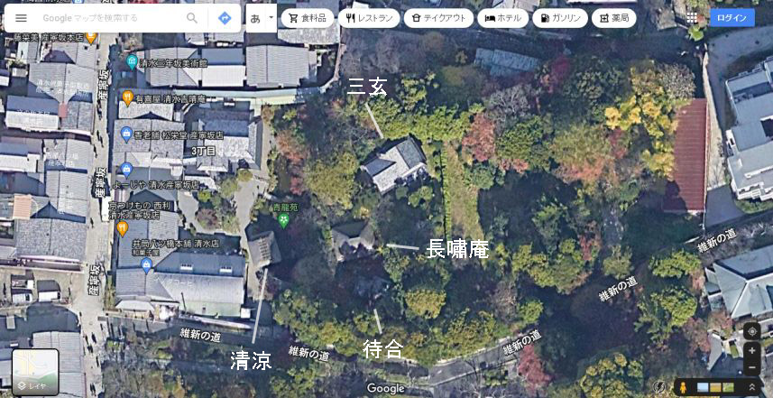 上を手前に入った所の「長嘯庵」と「待合」らしい。茶室移設後の撮影だとすれば合点がゆく。